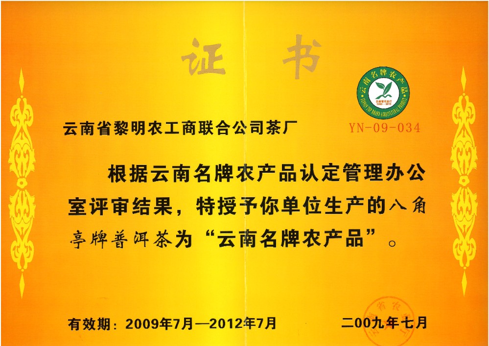 發證機構:   云南省農業廳 發證時間 :   2009-07-01