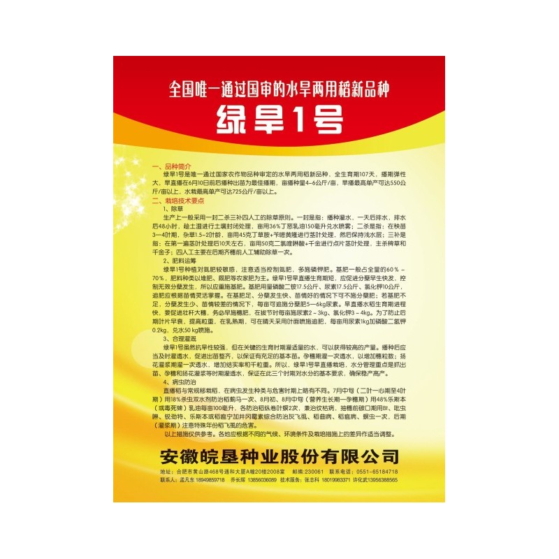 【風險提示】:種子應儲藏在低溫(25℃以下)、干燥(相對濕度70%以下)及通風處;種子調運后及時做好防潮、防濕、防蟲、防鼠等工作并在上述條件下進行儲藏,做到在安全儲藏條件下、質量保證期內(nèi)規(guī)范安全用種;請遵照當?shù)剞r(nóng)技部門做好科學栽培,做好稻瘟病、稻曲病、紋枯病、白葉枯、條紋葉枯病、黑條矮縮病、螟蟲、稻飛虱等病蟲害的綜合防治工作,由于栽培措施不當和病蟲害及氣候等因素造成的一切損失責任自負;按審定適宜種植區(qū)域種植,超區(qū)域銷售或種植造成的損失責任自負,公司概不負責;根據(jù)種植季節(jié)結合當?shù)睾侠戆才挪テ?,?guī)避因高低溫、風暴倒伏等人為不可抗逆因素造成的損失。