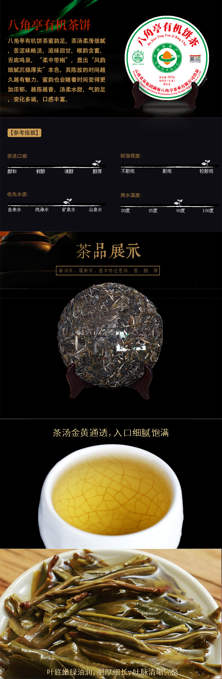 八角亭茶業原為黎明農工商聯合公司(黎明農場)下屬茶葉加工組,始于一九六四年,從事茶葉產品開發生產五十余載,一九八四年建成標準化工廠,二00一年開始生產普洱茶,截止到2013年,公司累計生產各種普洱茶數百個品種共12000余噸。
