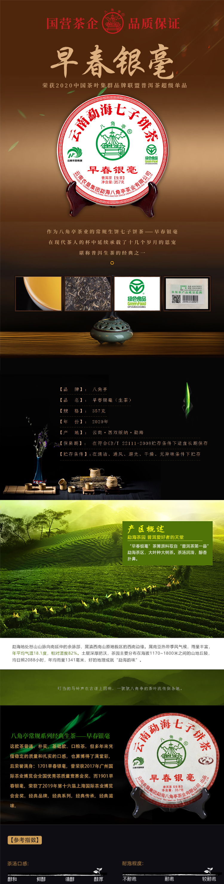 云墾茶業(yè)集團(tuán)下屬茶葉生產(chǎn)企業(yè)——云南農(nóng)墾集團(tuán)勐海八角亭茶業(yè)有限公司原名黎明茶廠,是我國歷史最為悠久的茶企之一,曾位列“中國普洱茶十大知名品牌”“十大最受歡迎茶葉品牌”、“中國普洱茶十大暢銷品牌”中,成為今天市場上最有影響力的品牌之一。公司產(chǎn)品獲得“綠色食品”、ISO9001、 HACCP和云茶品牌(YC)4項(xiàng)認(rèn)證,連續(xù)獲得“云南名牌農(nóng)產(chǎn)品”“云南名牌產(chǎn)品”“云南省著名商標(biāo)”等品牌榮譽(yù),公司生產(chǎn)的多款普洱茶在歷次專業(yè)評比中多次獲得特等金獎(jiǎng)和金獎(jiǎng)。在2018第五屆中國企業(yè)五星品牌論壇上,云南農(nóng)墾集團(tuán)勐海八角亭茶業(yè)有限公司上榜中國普洱茶行業(yè)影響力品牌——“金芽獎(jiǎng)”,公司負(fù)責(zé)人陳勝軍先生獲“陸羽獎(jiǎng)”,被授予2017“國際十大杰出茶人”榮譽(yù)稱號(hào)。