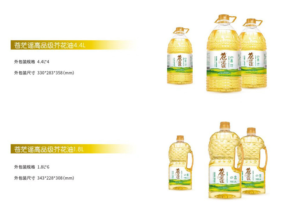 蒼茫謠壓榨一級芥花油系列產品具有高油煙點、營養豐富、口感好的特點,是可以直接適量飲用或拌涼菜、沙拉的健康廚房食用油新選擇。